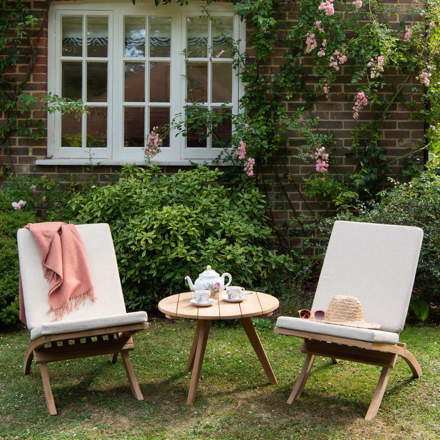 Two teak wooden reclining chairs with cushions and teak round table in between, on a grassy area in front of a brick building.