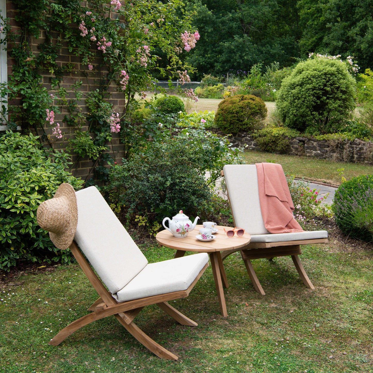 Garden setting with teak wooden reclining chairs, table, and teacup, surrounded by greenery.