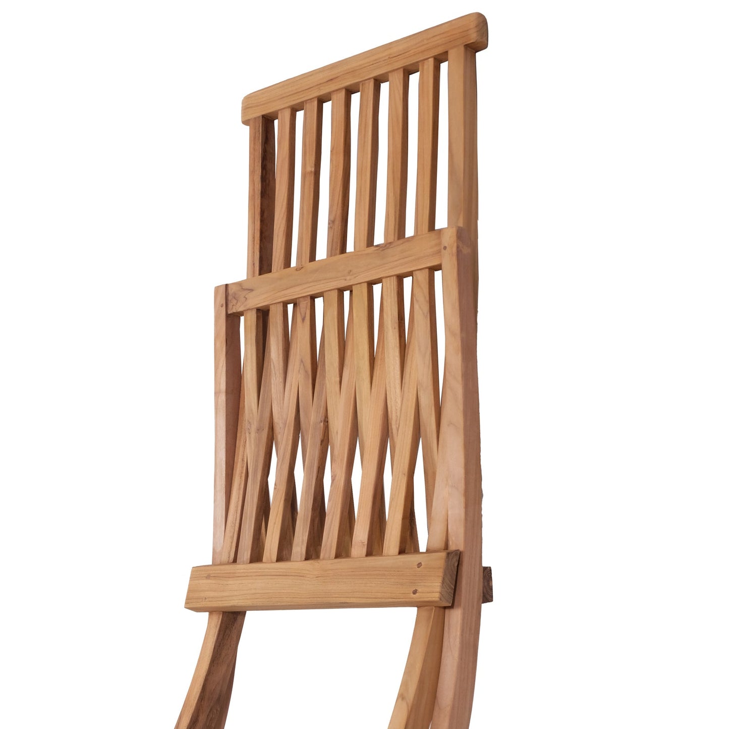 Teak wooden chair with slatted design on a white background