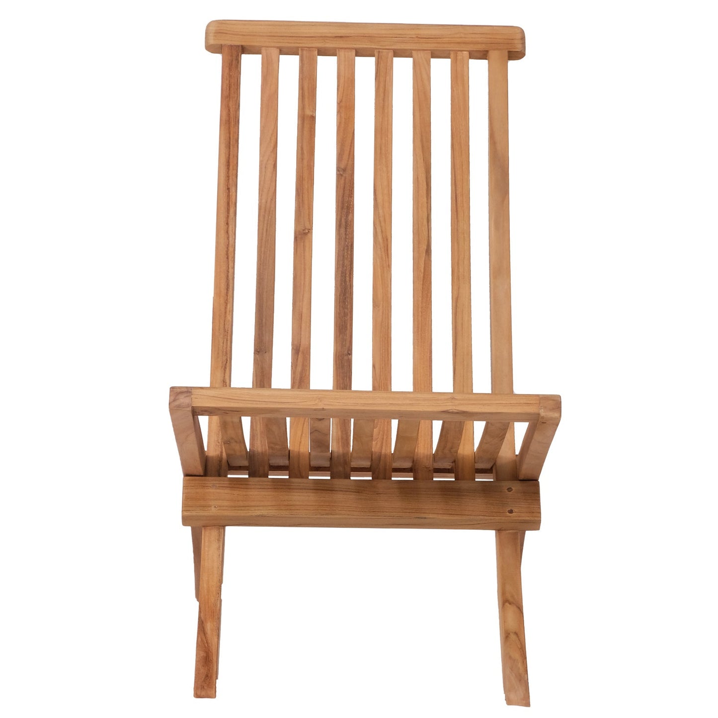 Head on view of teak, folding lounging chair, on white background