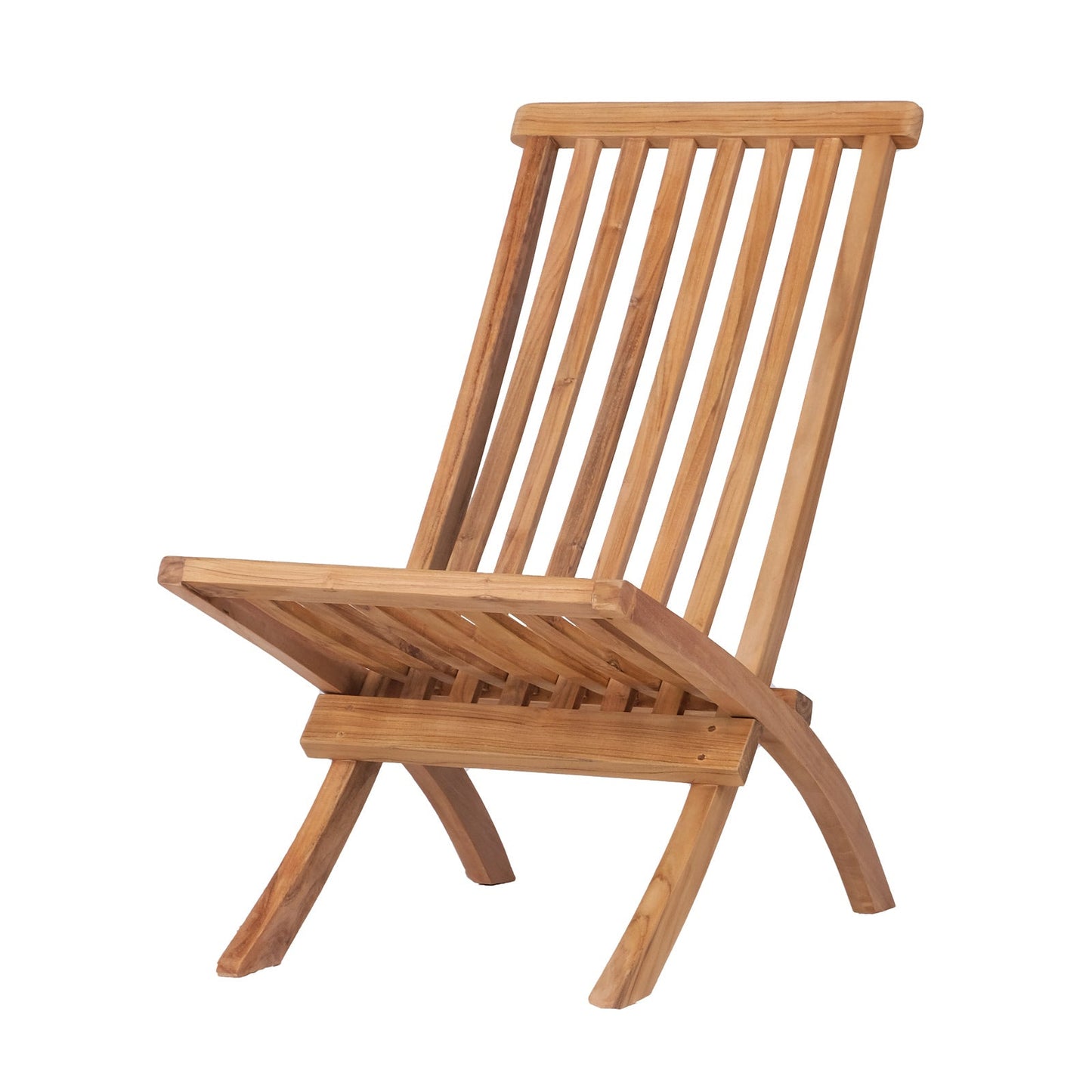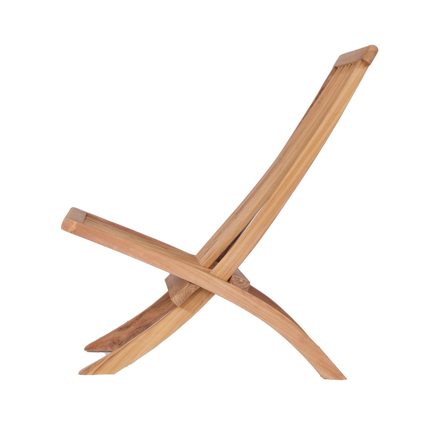 Side view of teak folding chair with slim, slatted seat and backrest
