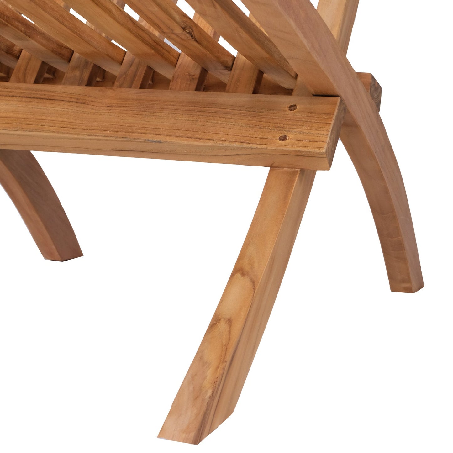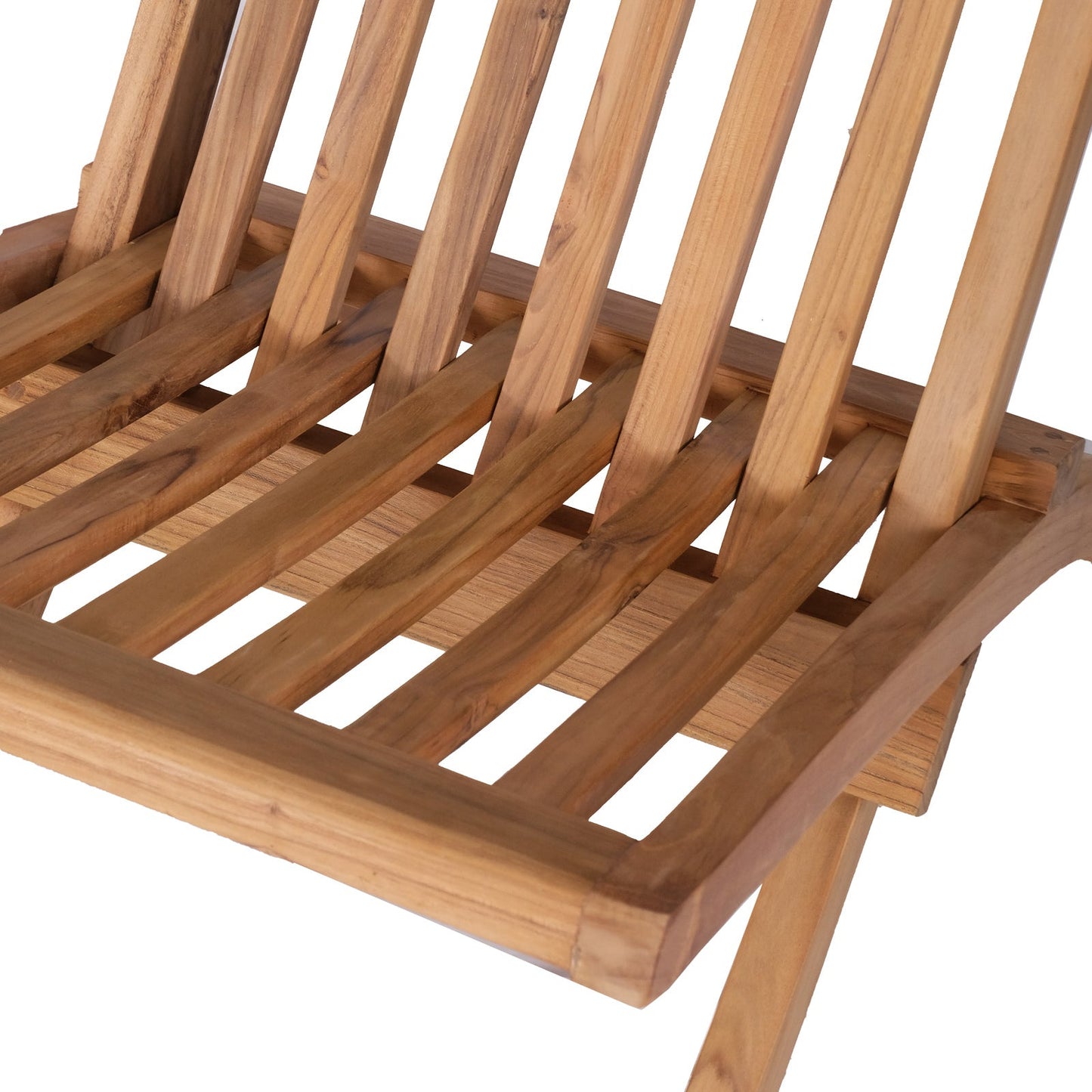 Close up of angle where seat of slim, slatted teak folding chair meets backrest.
