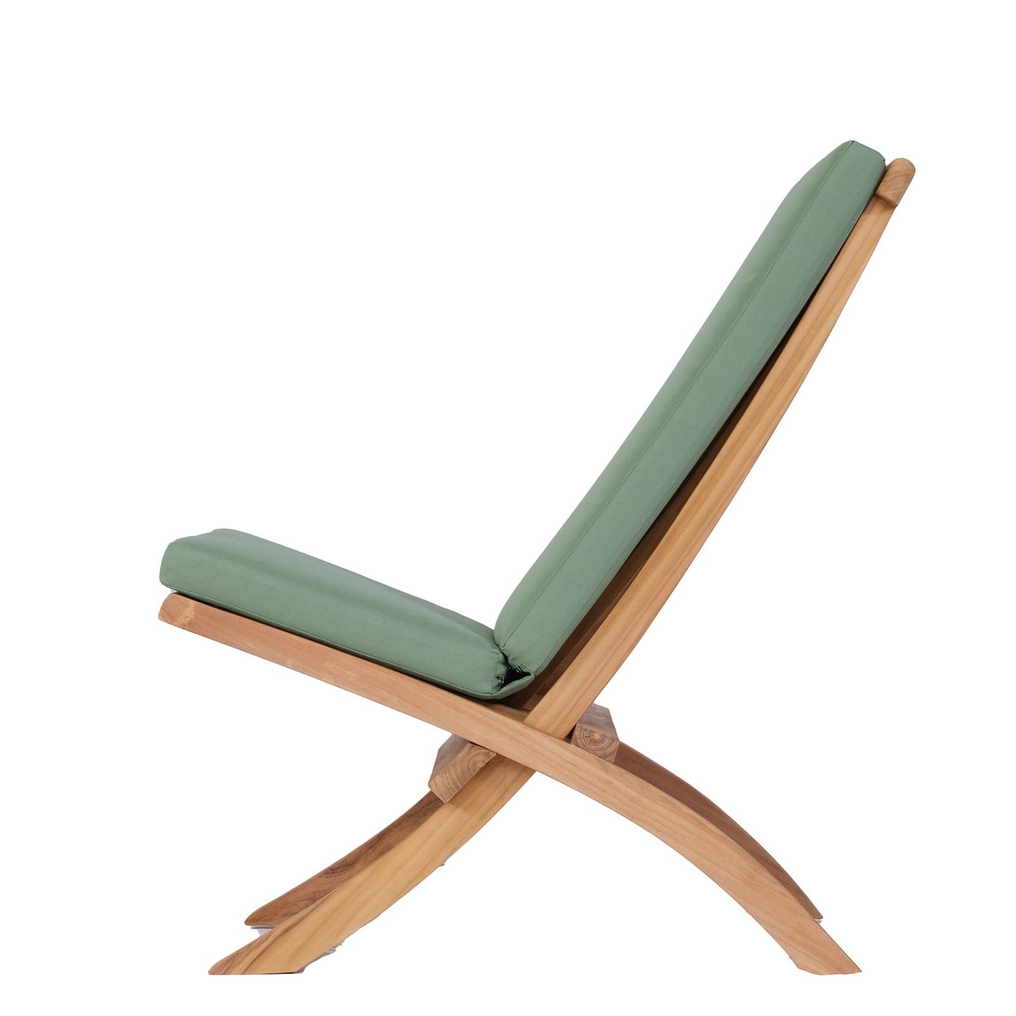 Side view of teak reclining, folding chair with beige cushions.